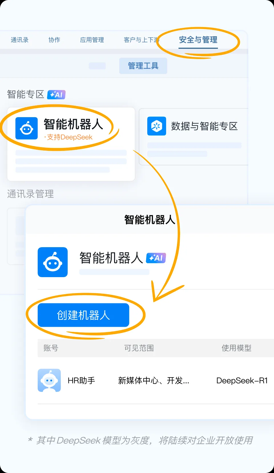 企业只要配好机器人的名称、设置好角色,比如“IT 助手”、“财经助手”、“行政助手”、“门店助手”等,选择 DeepSeek、混元等模型,就能创建企业内部专属的智能机器人。